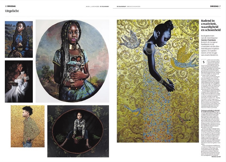 De Amerikaanse kunstenaar Tawny Chatmon (1979) transformeert het imago van zwarte kinderen en jongeren door ze te portretteren op manieren die de creativiteit uit de Afro- Amerikaanse tradities viert - kleding, haarstijlen, voedsel, omgeving. Ze plaatst ze in een sfeer van schoonheid die doet denken aan de meest luxe kunst uit Europa: Gustav Klimts vrouwen badend in goud en decoraties, middeleeuwse gouden iconen en Italiaanse en Franse portretten.